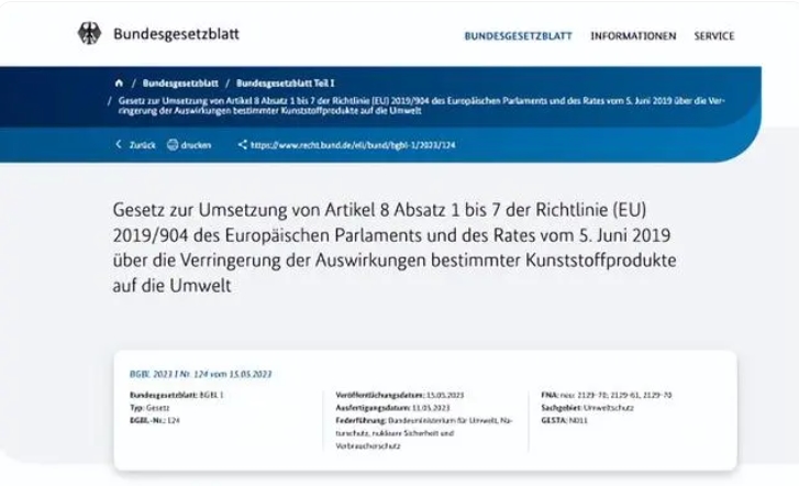 2023年5月11日,德國通過了一次性塑料基金法(EWKFondsG),該立法旨在執(zhí)行歐盟發(fā)布的《關于減少某些塑料制品對環(huán)境影響的第2019/904號指令》,以減少和防止一次性塑料產(chǎn)品對環(huán)境的負面影響。