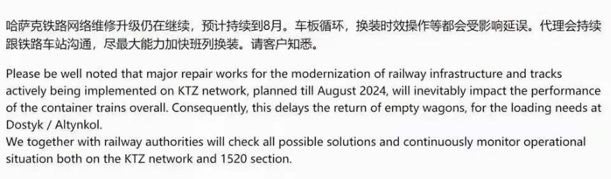 2. 最近哈薩克鐵路網絡維修升級,預計持續(xù)到8月才能緩解。而且因柜量增多,可以循環(huán)使用的車板不夠,換裝以及操作等都會受影響,導致時效延誤。請有需要的業(yè)務注意提醒客戶提前合理做好出貨計劃,結合時效需求選擇匹配的物流運輸方案, 可考慮空運和卡航。
